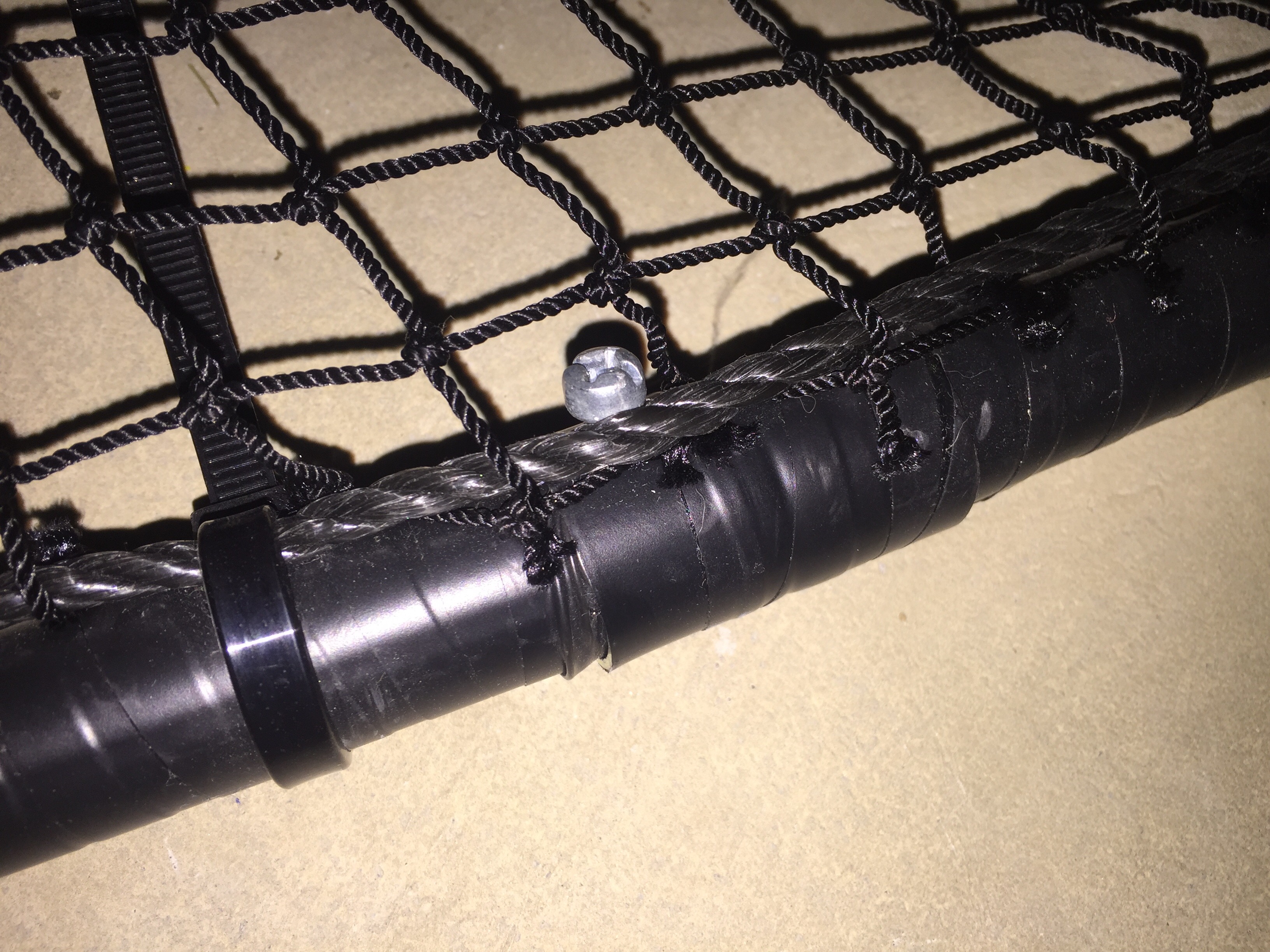 Once I had those four corners established, I started attaching the net to the midpoints between the zip ties. I kept added more zip ties to each midpoint until each zip tie was about 12" apart. My guess is attaching the net this way helps to make sure it's nice and evenly tight across the net's surface.